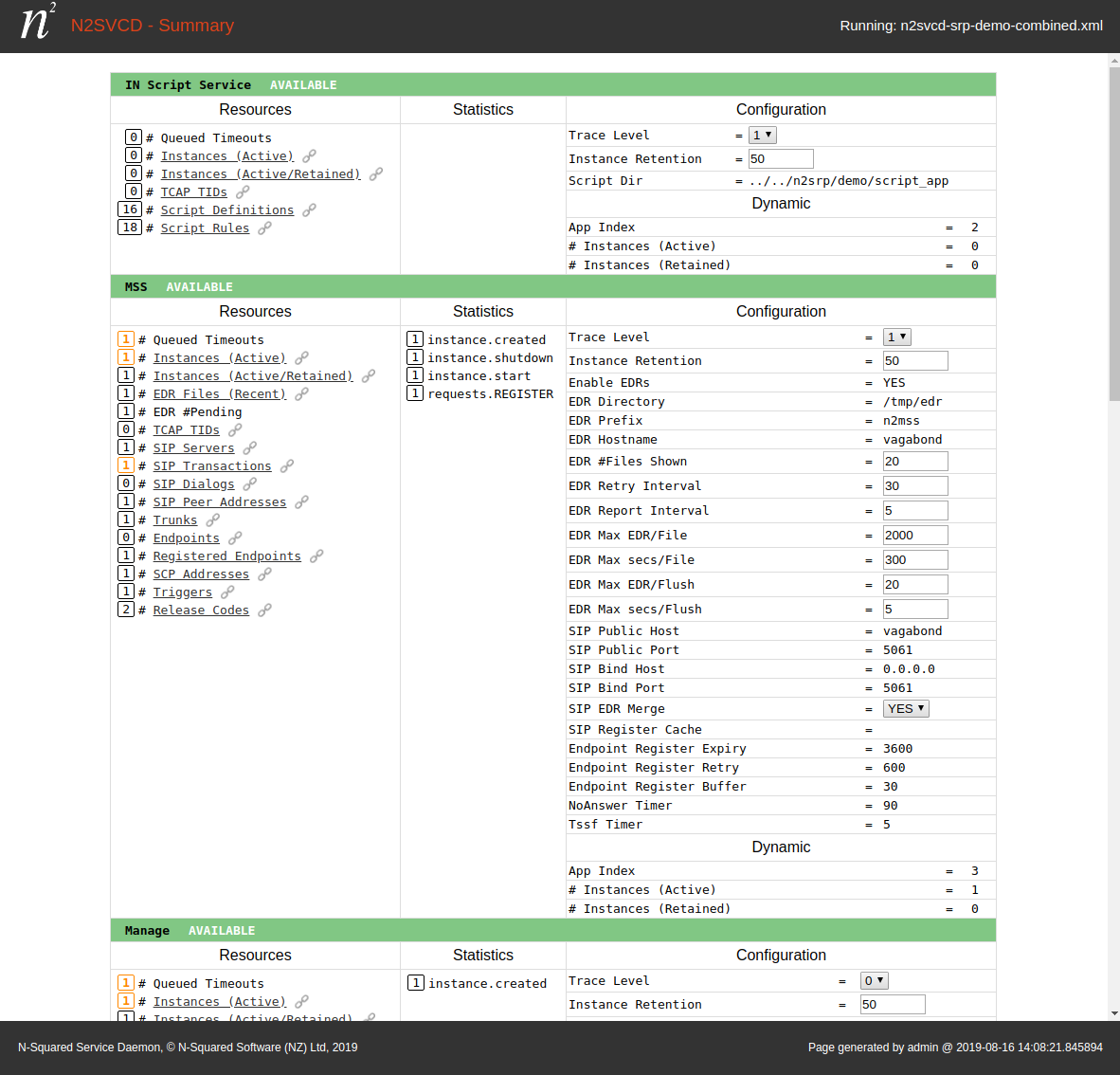 The N2SVCD Management Application provides a simple HTTP server to which operators can connect in order to view the current N2SVCD running configuration. Drilldown links allow operators to monitor in-use resources (e.g. to check connection status, and to review long-running calls in progress).